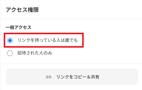 上記で記載したような情報漏洩のトラブルを防ぐには、検索履歴の共有範囲を「リンクを持っている人は誰でも」に切り替えておくのが安心です。