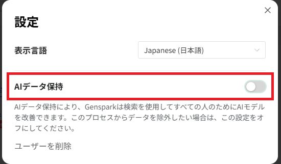 こうしたリスクを回避するには、「AIデータ保持」の設定をオフに変更するだけでOKです。Gensparkの設定画面を開き、該当項目を「オフ」に切り替えておけば、今後の検索履歴や入力情報がAIの学習に反映されることはありません。