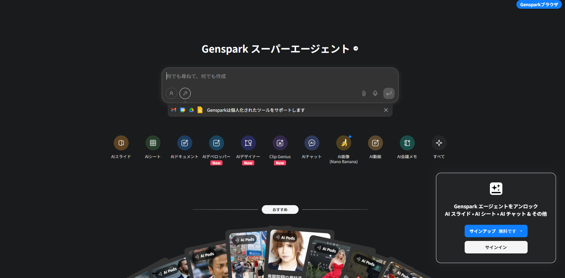 Gensparkは、AIを活用した情報検索・業務支援ツールです。特にGmailやGoogleカレンダー、GoogleドライブといったGoogleサービスと連携できるのが大きな特長で、ユーザーの指示に応じて、メールの要約や予定の確認・追加といった操作を自動で行ってくれるため、作業の手間を減らすことができます。