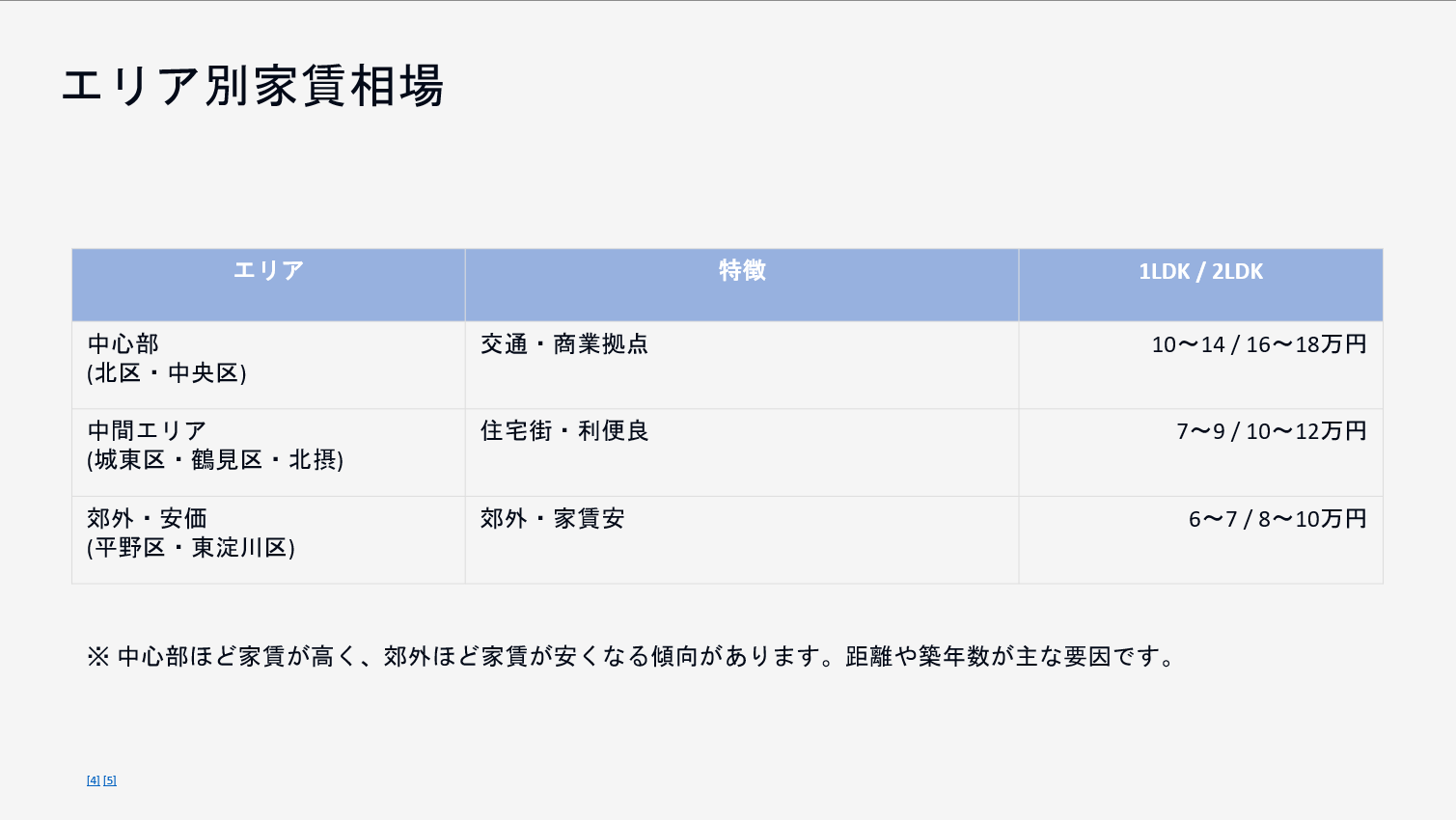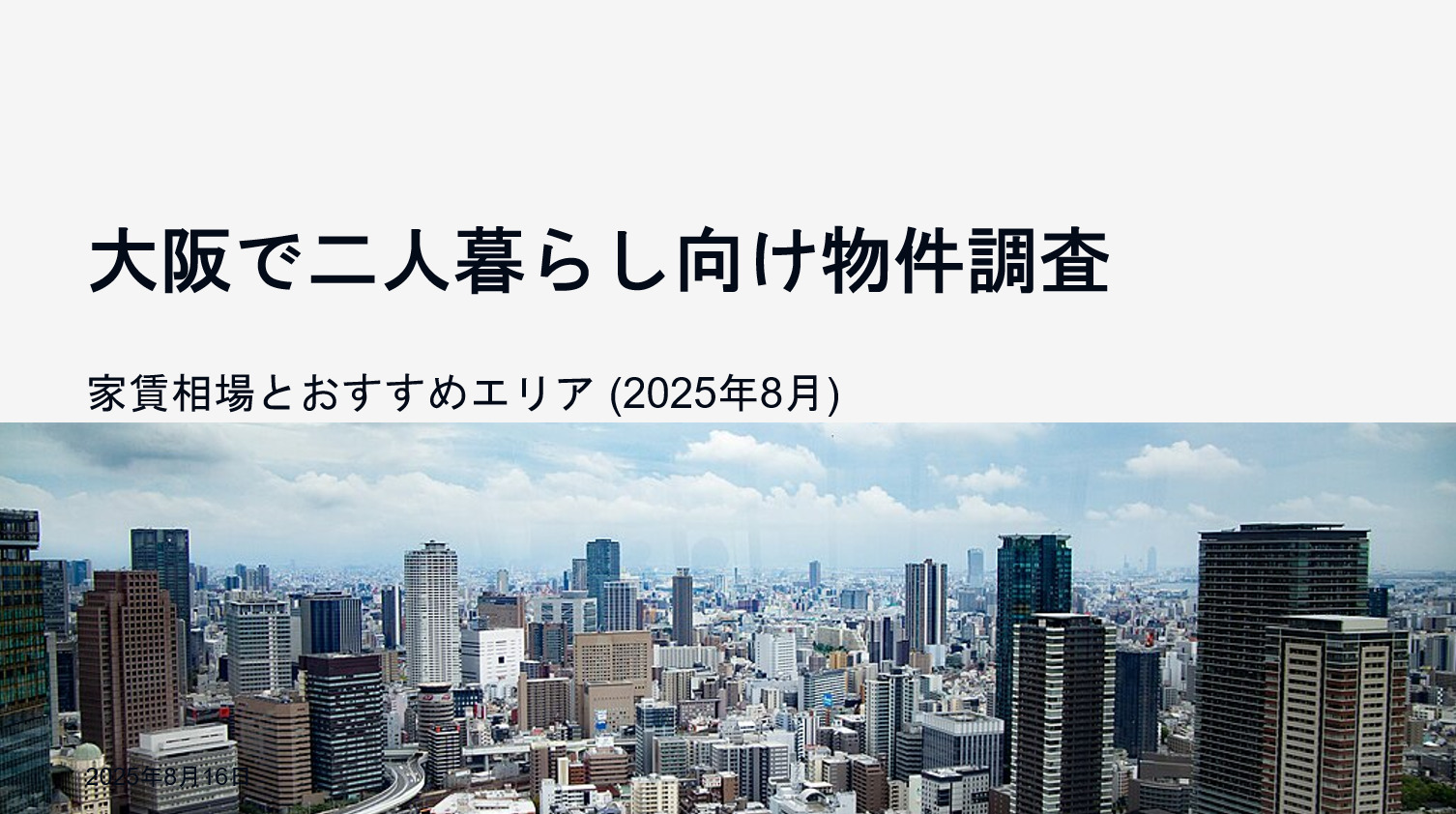 さらに、複数サイトからの情報収集や要約、比較データのレポート出力も得意とし、条件に応じた物件調査や価格リサーチなど、実務的な処理にも柔軟に対応します。例えば、大阪エリアで二人暮らし物件の調査を依頼すると、以下のような資料を作成してくれます。