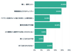 • その他、「ベテラン社員がAIへの協力を拒む(心理的抵抗)」(11.0%)や「どの業務から適用すれば良いか分からない」(8.5%)といった、導入プロセスの具体的な悩みも挙げられた。